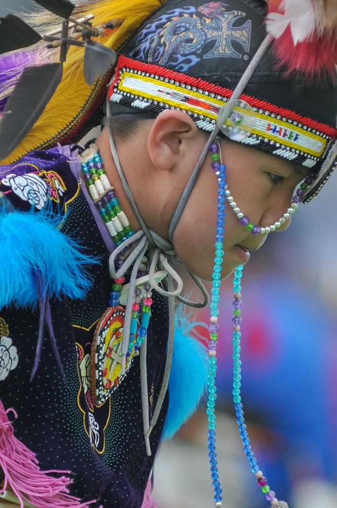 Deze prachtig verklede Indiaanse jongen tijdens de danswedstrijden van de Blackfoot Indianen in Browning Montana VS