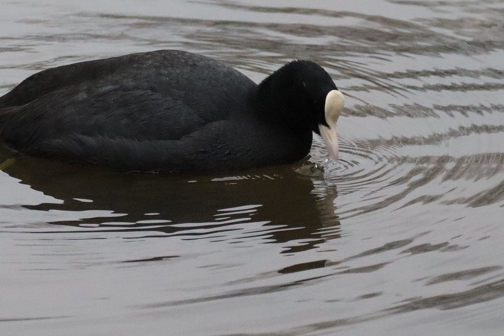 Blässhuhn klopft mit dem Schnabel auf das Wasser. Er schwimmt in der Vecht bei Utrecht.
