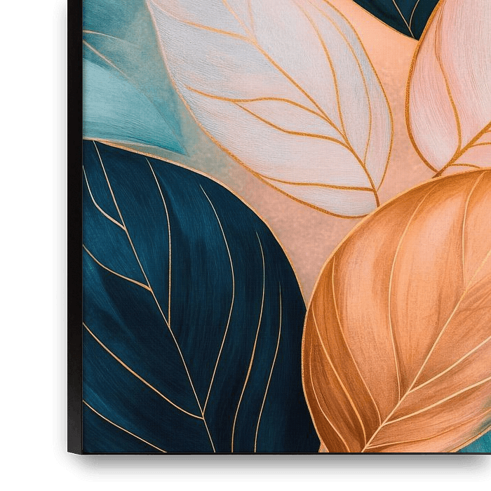 Ein harmonisches Zusammenspiel von Farben entfaltet sich, während zarte, geschwungene Blätter in sanften Tönen von Mintgrün über Beige bis hin zu dunklem Blau miteinander tanzen. Die filigranen Adern verleihen jedem Blatt Charakter und Tiefe, umhüllt von einem warmen, einladenden Hintergrund, der an die Ruhe eines stillen Gartens…