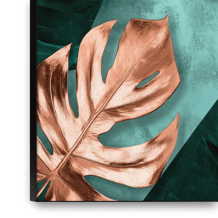Tropische Eleganz entfaltet sich in satten Grüntönen, während kunstvoll schimmernde, kupferne Blätter einen faszinierenden Kontrast schaffen. Die geschwungenen Formen der Blätter verleihen der Komposition eine lebendige Dynamik, die den Betrachter in eine exotische Oase entführt. Ein harmonisches Zusammenspiel aus Farben und Texturen…