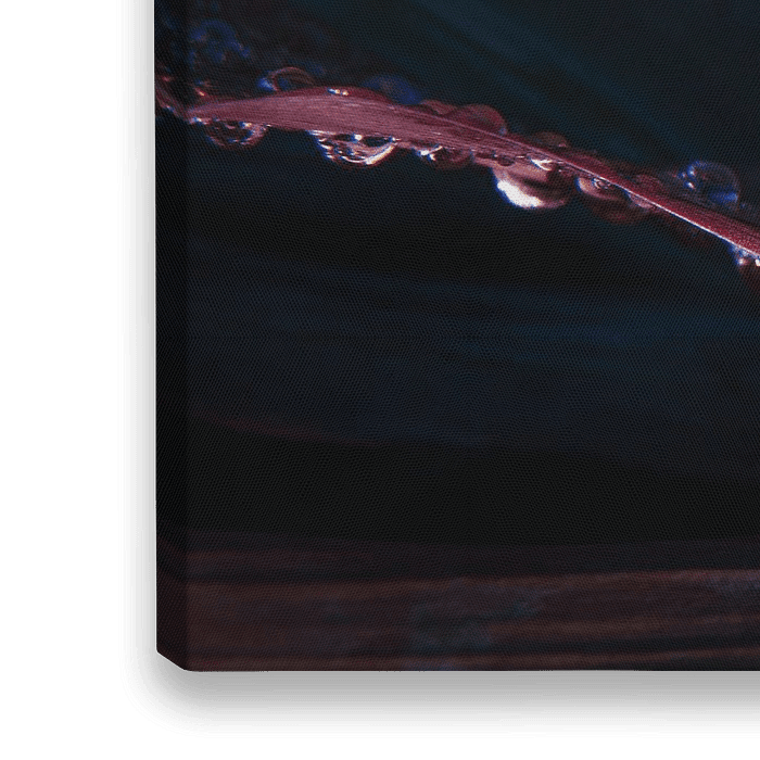 Tropfen auf einem grünen und rosa Blatt. Tau/Regentropfen haben einen blauen Farbton.