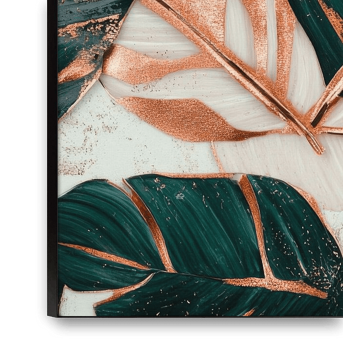 Ein harmonisches Zusammenspiel aus satten, grünen Blättern und schimmerndem Roségold entfaltet sich hier. Die organischen Formen und feinen Details der Blätter treffen auf einen eleganten, hellen Hintergrund, der die goldenen Akzente zum Strahlen bringt. Diese Komposition strahlt sowohl natürliche Frische als auch edles Flair aus und…