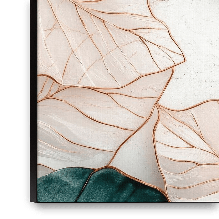 Ein harmonisches Spiel aus sanften Grüntönen und zarten Beigenuancen entfaltet sich, während die filigranen Blätter wie ein kunstvolles Wandgemälde ineinanderfließen. Ihre detaillierten Adern verleihen der Komposition eine lebendige Eleganz, die an die sanfte Berührung der Natur erinnert. Ein ruhiger Hintergrund ergänzt das kreative…