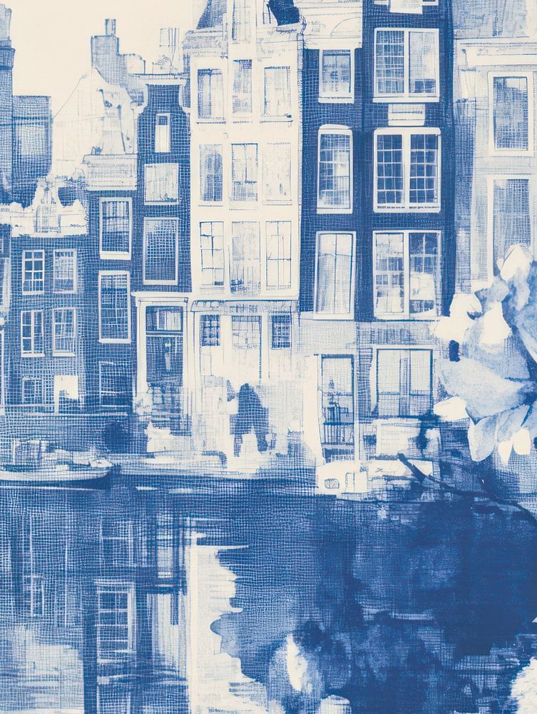 Ein verträumtes und raffiniertes Kunstwerk, in dem sich die ikonischen Amsterdamer Grachtenhäuser im ruhigen Wasser spiegeln, eingerahmt von blühenden Rosen in klassischem Delfter Blau. Diese Komposition strahlt Ruhe, Eleganz und Nostalgie aus. Perfekt für alle, die die niederländische Kultur, zeitlose Schönheit und eine künstlerische Anspielung auf die Porzellantradition lieben. Ein Blickfang, der sowohl klassisch als auch modern wirkt.