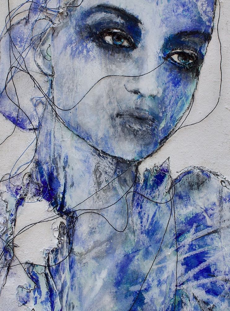 Ein blaues Porträt aus Acryl, Papier und Draht auf Leinwand. Kraftvoll und verletzlich, ohne Gefühl.