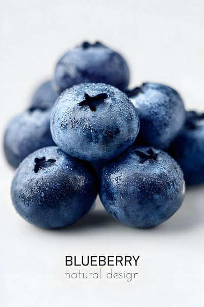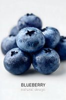 Eine extreme Nahaufnahme frischer Blaubeeren zeigt ihre samtige Oberfläche, feine Wachsschicht und zarte Wassertropfen. Die Früchte liegen dicht beieinander vor hellem Hintergrund; darunter der Schriftzug „blueberry – natural design“, der die Bildaussage visuell ergänzt.