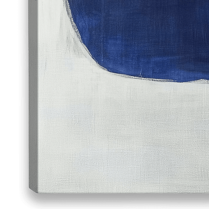 Blue Abstract | Depths of Calm Waters - Dieses abstrakte Gemälde zeichnet sich durch zwei markante, halbkreisförmige Formen aus; die untere in einem tiefen, gesättigten Blau und die obere in einem helleren, weicheren Blau, getrennt durch ein breites, weißliches horizontales Band, das Ruhe und Ausgeglichenheit ausstrahlt.
