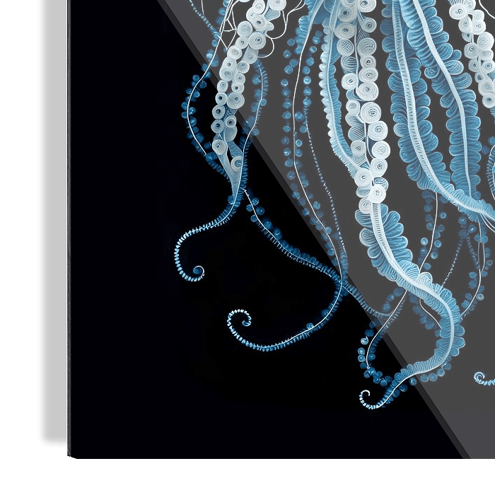 Eine von Delfter Blau inspirierte Qualle, die in den dunklen Tiefen der Nordsee schwimmt. Die Eleganz des Meeres, erzählt in digitalen Pinselstrichen. Eine moderne Ode an zeitlose Schönheit mit futuristischem Look.