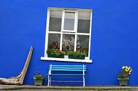 Der dynamische und farbenfrohe Baustil der irischen Cottages spiegelt sich hier in der intensiv blauen Wand mit einer blauen Bank, einem Blumentopf und anderen Ornamenten wider.