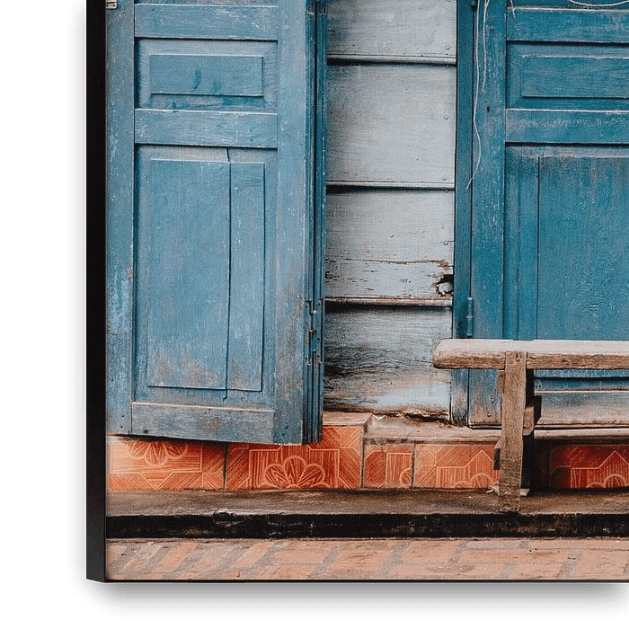 Über „Blaue Holztür in Vang Vieng | Laos | Reisefoto“ von Expeditie Aardbol
