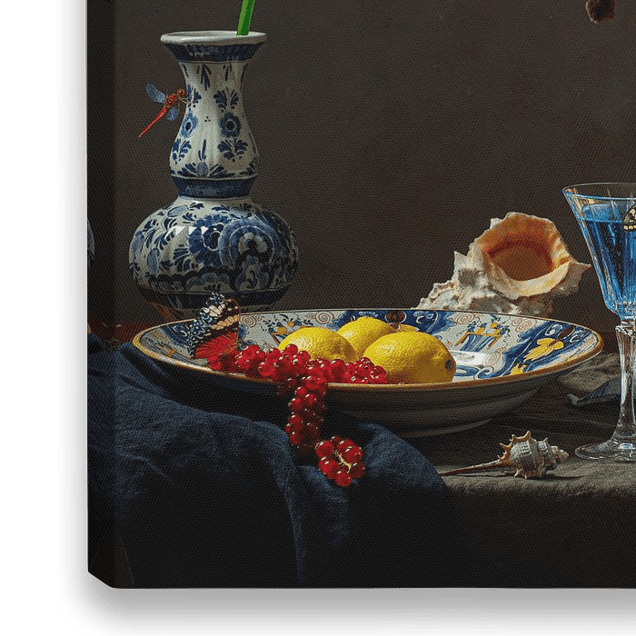 Stilleben von Zitronen und Johannisbeeren in einer großen antiken Schale, daneben ein Kristallglas mit blauem Likör. Dahinter links eine Delfter blaue Vase mit einer roten Papageientulpe, daneben eine große Muschel und eine sehr große rote Glasvase mit einem Zweig mit roten Hängeblumen darin. Alles auf einer Leinentischdecke auf dem…