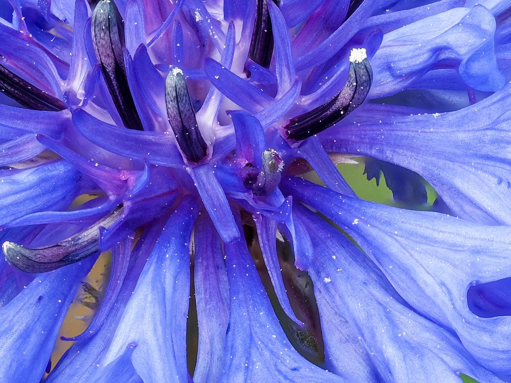 Nahaufnahme einer blauen Kornblumenblüte (Centaurea cyanus) vor grünem Hintergrund