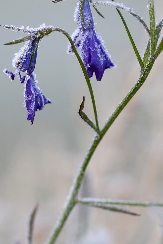 Ein Detailfoto einer blauen Lobelie, aufgenommen an einem kalten Morgen im Winter.