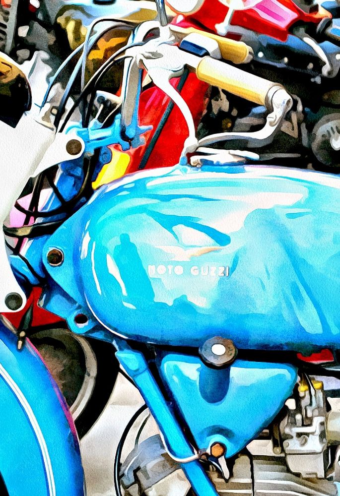 Eine Reihe von geparkten Motorrädern wird von einer Gruppe von Motorradfans bewundert. Ganz vorne in der Reihe steht ein schönes, klassisches, blaues Moto Guzzi-Motorrad. Moto Guzzi ist einer der Hersteller von klassischen italienischen Motorrädern. Diese Szene spielte sich bei der jährlichen Monte Cetona Classic Car and Motorcycle Rally in der Toskana, Italien, ab. Eine blaue Moto Guzzi und Freunde.