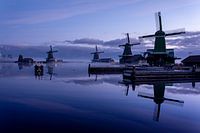 Blaue Stunde an der Zaanse Schans mit fünf Mühlen in einer Reihe. Die letzte Mühle hat keine Flügel. Der Fluss Zaan ist spiegelnd und glatt, in dem sich die Landschaft widerspiegelt. Nebel und Raureif am frühen Wintermorgen.