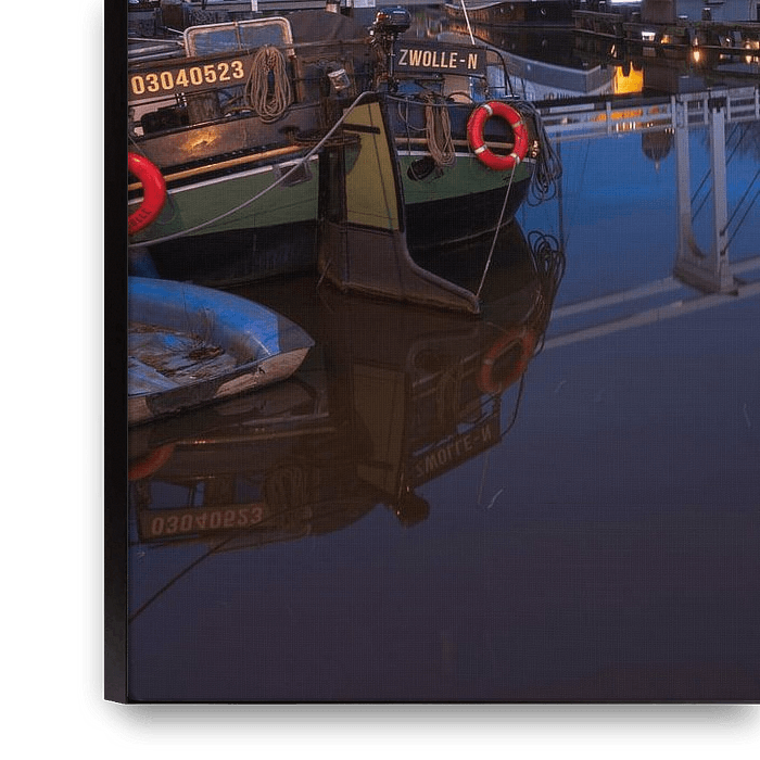 Blaue Stunde an der Thorbecke-Gracht in Zwolle. Die Pelzbrücke und die Gebäude spiegeln sich wunderschön im Wasser wider.