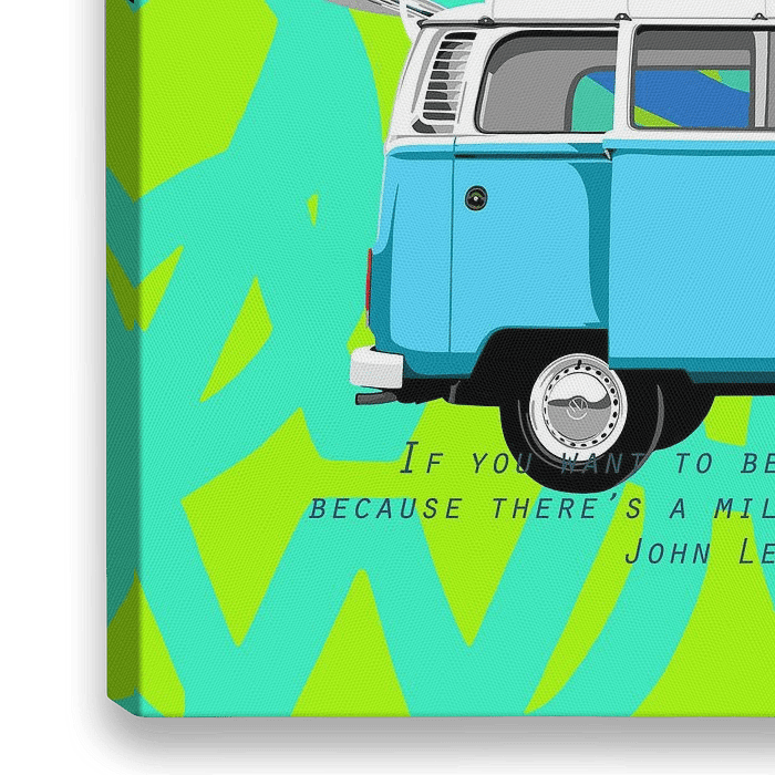 Bestelle dieses moderne Wandbild Blaue VW Bus Flower Power von Jole Art als Reproduktion auf Leinwand, Alu-Dibond, als Poster, Fototapete oder Acrylglasbild.