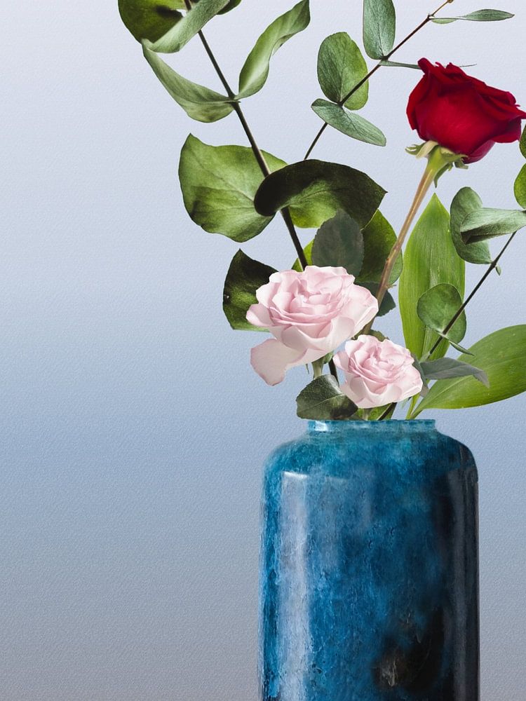 Drei rote und rosa Rosen mit weißen und einigen grünen Zweigen in einer blau-schwarzen Blumenvase auf einem braunen Holztisch mit blau-grauem Hintergrund. Schön als Gemälde für die Wohnzimmerwand