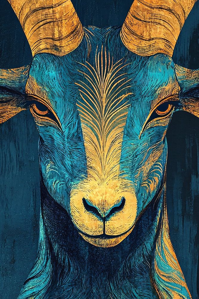 Ein wunderschönes digitales Kunstwerk, das eine beeindruckende blaue Ziege mit goldenen Details und verschnörkelten Mustern zeigt. Dieses moderne Design strahlt Raffinesse aus und ist ein echter Blickfang in jedem Interieur. Die detaillierten Linien und die kontrastreichen, leuchtenden Farben machen es zu einem perfekten Bild für Liebhaber moderner Kunst und Tierporträts. Ideal für Wohn-, Büro- oder Schlafzimmer, wo ein Hauch von künstlerischem Flair gewünscht wird. Verleihen Sie Ihrem Raum mit diesem stilvollen Meisterwerk eine einzigartige und eindrucksvolle Atmosphäre.