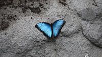 Ein leuchtend blauer Schmetterling ruht auf rauem Stein und zieht sofort die Aufmerksamkeit auf sich. Starker Kontrast, pure Einfachheit. Ein eleganter Druck, der Farbe und Ruhe in moderne Innenräume, Flure oder Studios bringt.