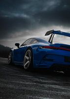 Eine Aufnahme eines atemberaubenden blauen Porsche 911 (992) GT3 auf nassem Asphalt, dramatisch in Szene gesetzt vor einem düsteren, stürmischen Himmel, der die aerodynamischen Linien und die einzigartigen Zentralverschlussräder betont.