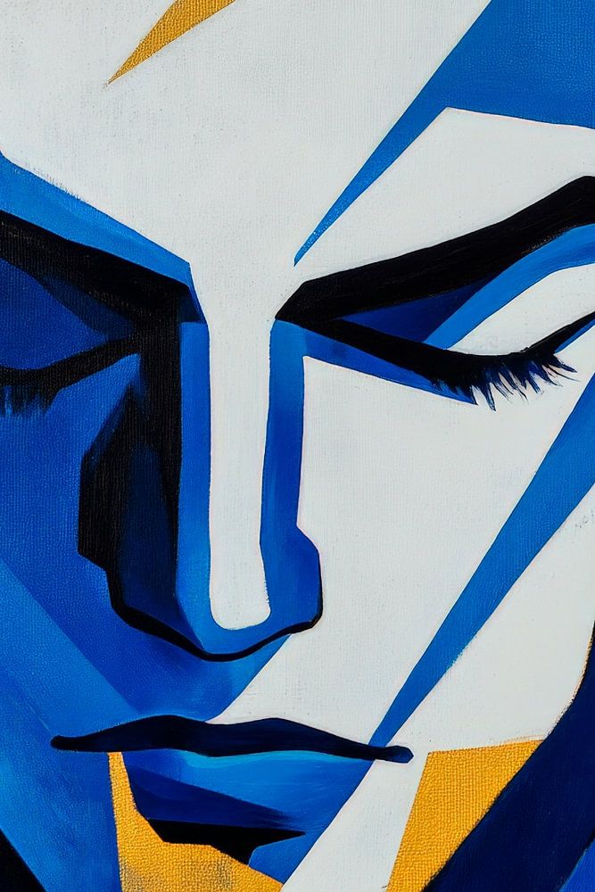 Ein faszinierendes Spiel aus kühlem Blau und goldenen Akzenten vereint sich in diesem ausdrucksstarken Porträt. Die abstrahierten Formen und der konzentrierte Blick strahlen eine kraftvolle Ruhe aus, die perfekt für ein modernes Wohnzimmer ist. Hier wird jede Diskussion über Kunst und Emotionen zum Erlebnis – ein wahrer Blickfang!