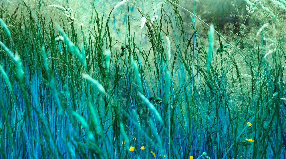 Eine Fotobearbeitung von blühendem Gras. Im Vordergrund sind gelbe Butterblumen als Kontrast im Blau. Weil ich Blau wirklich mag, habe ich das Ganze in diese Farben gelegt.