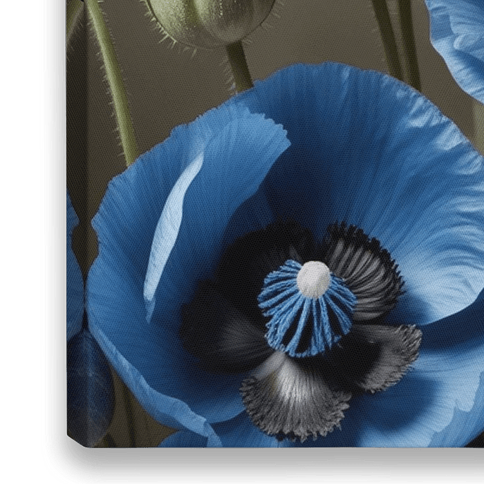 Hyperrealistisch gestaltete Abbildung des blauen Mohns. Schönes Blau an der Wand.