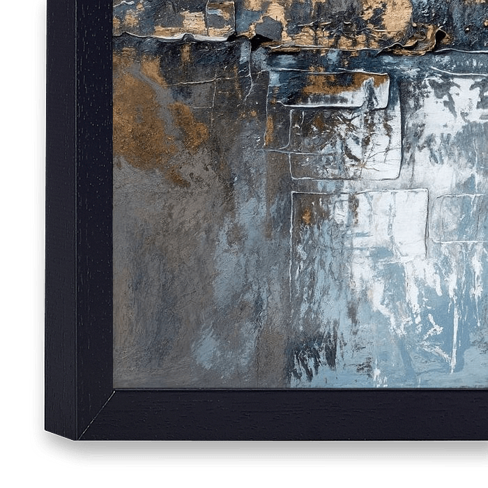 Ein abstraktes Gemälde mit blauen, grauen, weißen und bronzefarbenen Akzenten strahlt eine ruhige und elegante Atmosphäre aus. Dieses zeitlose abstrakte Werk strahlt Ruhe und Harmonie aus und verleiht Räumen einen edlen Look.