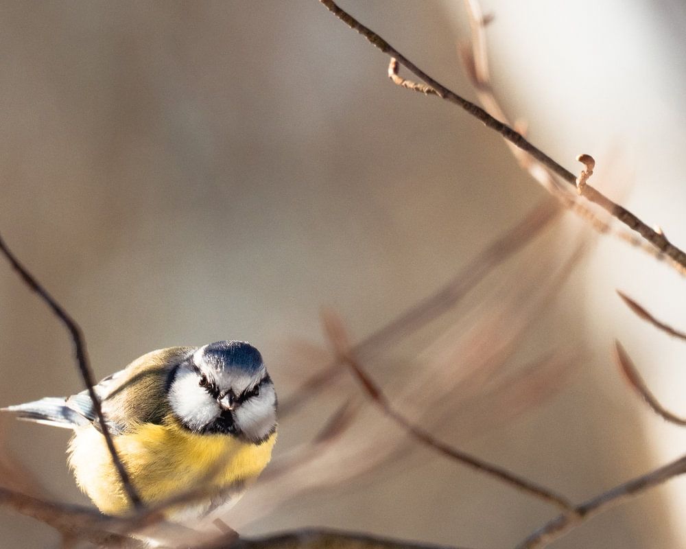 Diese Blaumeise sitzt auf dem Ast einer Buche (Fagus sylvatica), während die Sonne an diesem Wintermorgen zwischen den Ästen hervorkommt. Der Vogel blickt zu Ihnen und macht sich bemerkbar.
