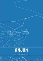 Blaupause der Karte / Karte der niederländischen Stadt Anjum, gelegen in der Gemeinde Noardeast-Fryslan, Provinz Fryslan. Die Karte enthält alle öffentlichen Straßen und die Koordinaten des Zentrums von Anjum.