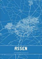 Blaupause der Karte / Karte der niederländischen Stadt Assen, gelegen in der Gemeinde Assen, Provinz Drenthe. Die Karte enthält alle öffentlichen Straßen und die Koordinaten des Zentrums von Assen.