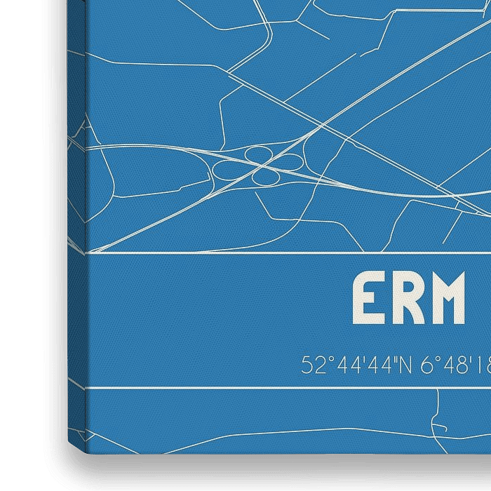 Blaupause der Karte / Karte der niederländischen Stadt Erm, gelegen in der Gemeinde Coevorden, Provinz Drenthe. Die Karte enthält alle öffentlichen Straßen und die Koordinaten des Zentrums von Erm.