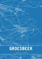 Blaupause der Karte / Karte der niederländischen Stadt Groesbeek, gelegen in der Region Rivierenland, in der Gemeinde Berg en Dal, Provinz Gelderland. Die Karte enthält alle öffentlichen Straßen und die Koordinaten des Zentrums von Groesbeek.