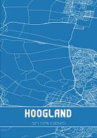 Blaupause der Karte / Karte der niederländischen Stadt Hoogland, gelegen in der Gemeinde Amersfoort, Provinz Utrecht. Die Karte enthält alle öffentlichen Straßen und die Koordinaten des Zentrums von Hoogland.