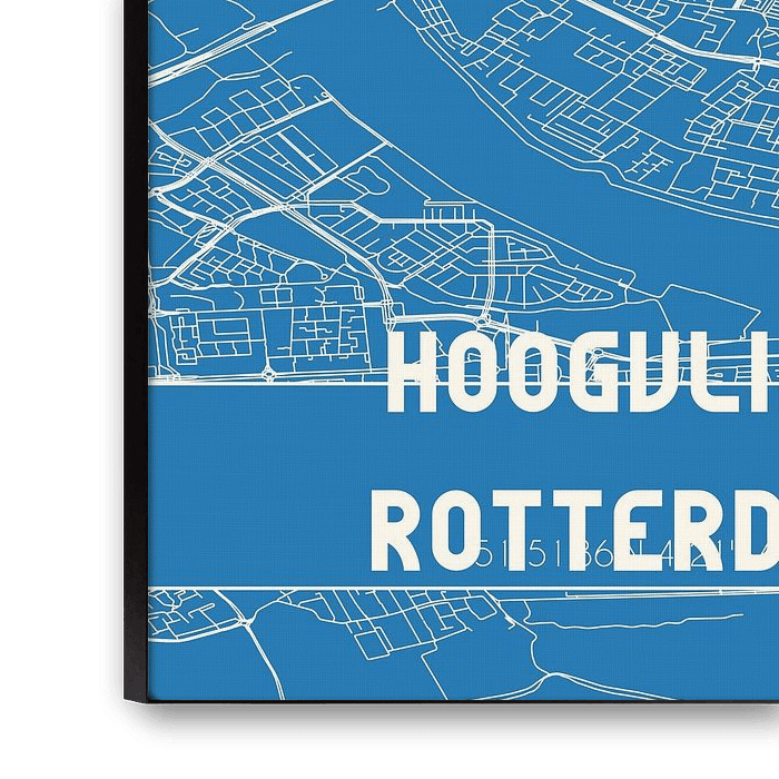 Blaupause der Karte / Karte der niederländischen Stadt Hoogvliet Rotterdam, gelegen in der Randstad, in der Gemeinde Rotterdam, Provinz Südholland. Die Karte enthält alle öffentlichen Straßen und die Koordinaten des Zentrums von Hoogvliet Rotterdam.