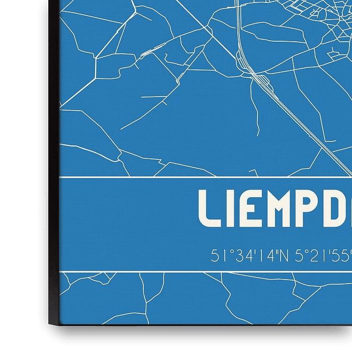 Blaupause der Karte / Karte der niederländischen Stadt Liempde, gelegen in der Gemeinde Boxtel, Provinz Nordbrabant. Die Karte enthält alle öffentlichen Straßen und die Koordinaten des Zentrums von Liempde.