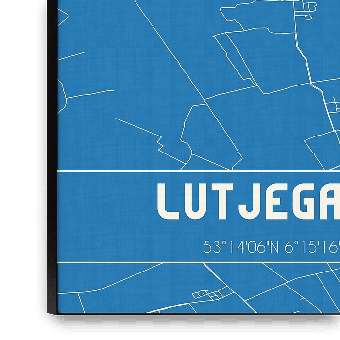 Blaupause der Karte / Karte der niederländischen Stadt Lutjegast, gelegen in der Gemeinde Westerkwartier, Provinz Groningen. Die Karte enthält alle öffentlichen Straßen und die Koordinaten des Zentrums von Lutjegast.