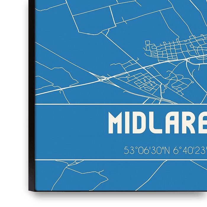 Blaupause der Karte / Karte der niederländischen Stadt Midlaren, gelegen in der Gemeinde Tynaarlo, Provinz Drenthe. Die Karte enthält alle öffentlichen Straßen und die Koordinaten des Zentrums von Midlaren.