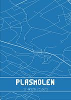 Blaupause der Karte / Karte der niederländischen Stadt Plasmolen, gelegen in der Gemeinde Mook en Middelaar, Provinz Limburg. Die Karte enthält alle öffentlichen Straßen und die Koordinaten des Zentrums von Plasmolen.