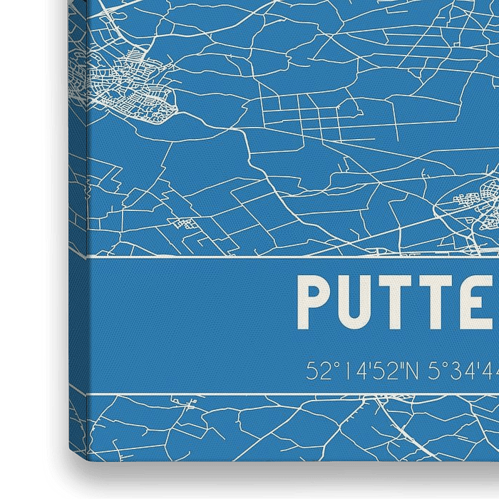 Blaupause der Karte / Karte der niederländischen Stadt Putten, gelegen in der Veluwe, in der Gemeinde Putten, Provinz Gelderland. Die Karte enthält alle öffentlichen Straßen und die Koordinaten des Zentrums von Putten.