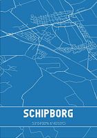 Blaupause der Karte / Karte der niederländischen Stadt Schipborg, gelegen in der Gemeinde Aa en Hunze, Provinz Drenthe. Die Karte enthält alle öffentlichen Straßen und die Koordinaten des Zentrums von Schipborg.