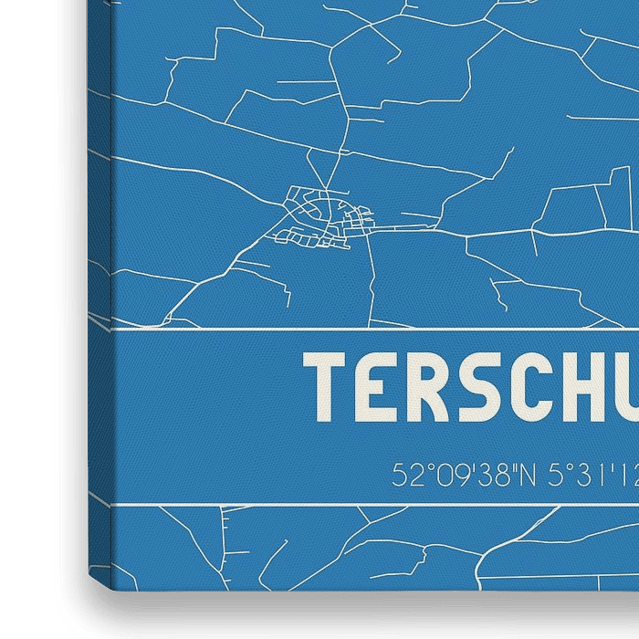 Blaupause der Karte / Karte der niederländischen Stadt Terschuur, gelegen in der Veluwe, in der Gemeinde Barneveld, Provinz Gelderland. Die Karte enthält alle öffentlichen Straßen und die Koordinaten des Zentrums von Terschuur.