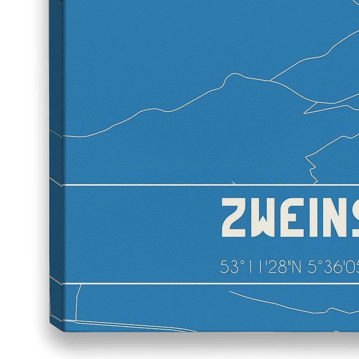 Blaupause der Karte / Karte der niederländischen Stadt Zweins, gelegen in der Gemeinde Waadhoeke, Provinz Fryslan. Die Karte enthält alle öffentlichen Straßen und die Koordinaten des Zentrums von Zweins.