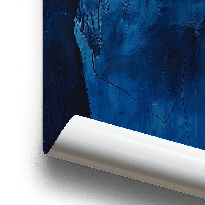 Dieses beruhigende, intime Kunstwerk zeigt zwei Menschen, die sich umarmen, dargestellt in einer Reihe von indigoblauen Farbtönen, die ein Gefühl von Tiefe und Emotion vermitteln.