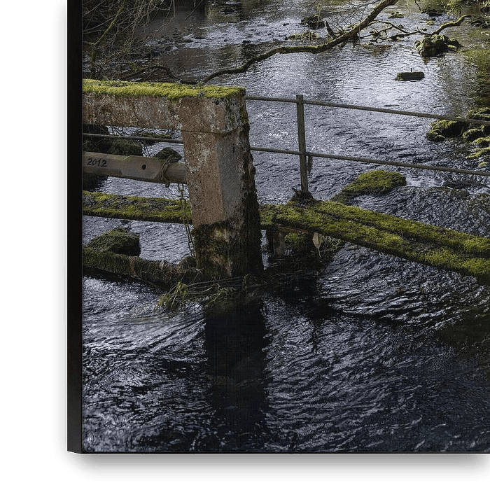 Bestelle das Foto Blautopfsee in Blaubeuren mit Zufluss und alter Holzbrücke von Andreas Freund als Reproduktion auf Leinwand, Alu-Dibond, als Poster, Fototapete oder Acrylglasbild.