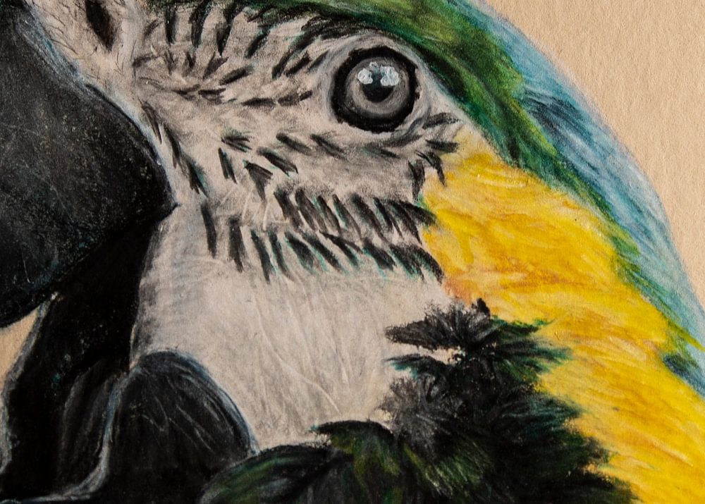 Tekening van een blauwgele ara in kleurpotlood met neutrale achtergrond