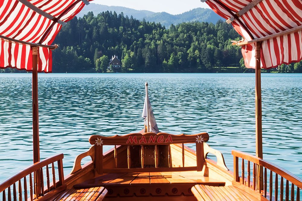 Das Foto zeigt eine Pletna, eines der traditionellen Holz-Ruderboote, die auch heute noch mit Muskelkraft die See-Insel ansteuern.