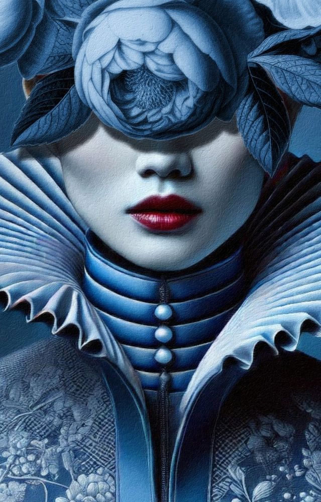 Ein bezauberndes und surreales Porträt einer Frau, eingehüllt in einen detailreichen, delfterblauen Mantel mit reichem Blumenmotiv. Ihr geheimnisvolles, schattiges Gesicht wird von einem majestätischen Kragen und einer beeindruckenden Krone aus monochromen Blumen eingerahmt. Die leuchtend roten Lippen bilden einen auffälligen Kontrast und ziehen sofort die Aufmerksamkeit auf sich. Dieses Kunstwerk verbindet klassische Porträts mit einem modernen, surrealen Flair und schafft so einen kraftvollen und eleganten Look.