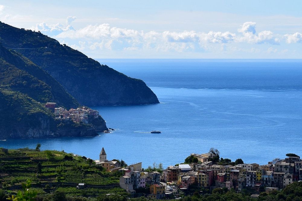 Blick auf Corniglia, Cinque Terre, Italien - blaue Bucht des Mittelmeers mit kleinem bunten Dorf auf einer steilen Klippe aus Fels und Stein